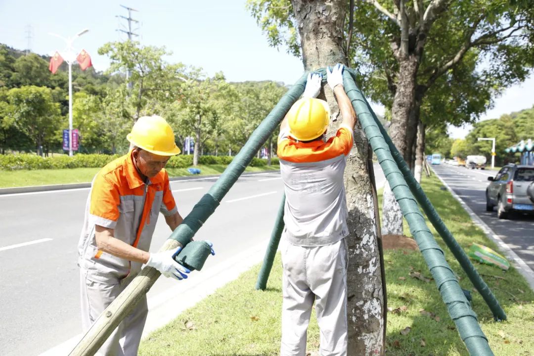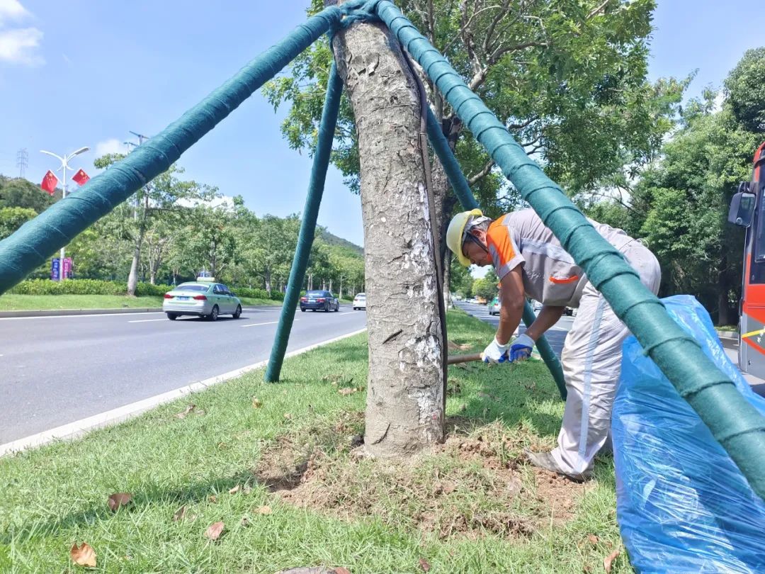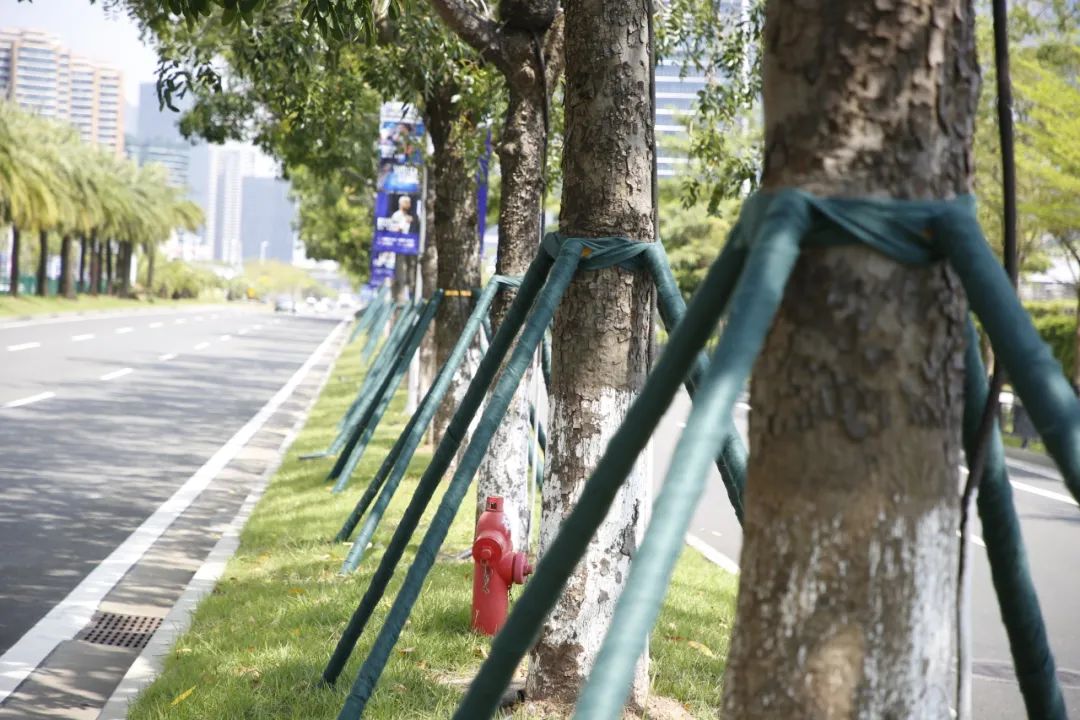 据了解,此次加固采用全木架支撑,下面是四根木桩,从四个不同的角度支撑树干,四根木桩之间先采用树木支撑固定器进行固定,再用绿布对支撑杆进行二次加固和美化。加固后的树木整齐划一,整体稳固性、观赏性得到提升。