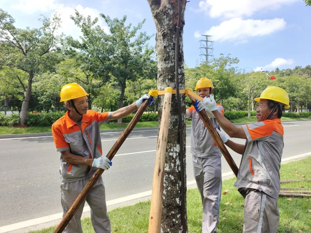 在遭受大风暴雨侵袭后,部分树木出现摇晃、倒伏现象。为防止树干再次倾倒,在及时扶正倒伏树木后,绿化养护人员抓紧给树木进行支撑加固。