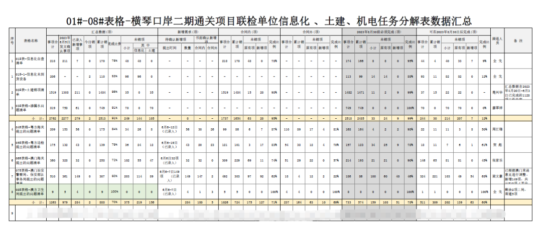 八是清单销项。口岸指挥部延续“5+2”、“白+黑”的工作模式,解决现场推进过程中遇到的实际问题,确保问题不过夜。冲刺阶段,更是坚持每天下午17:00组织参建单位召开工作协调推进会,重点梳理土建工程、信息化工程剩余工作推进情况、材料设备到场情况、质量问题整改情况等,形成8份销项表,包括粤方海关、粤方边检、澳方海关、澳方边检、澳方卫生局等需协调解决的问题,实行“问题清单销项督办”的机制,要求各责任人“锁定需求、对表作战,对照销项”。据统计,梳理大小问题多达3000余项。