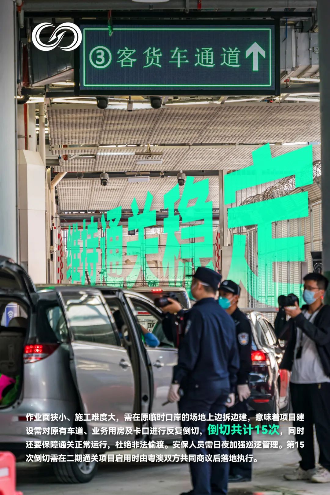 边腾挪转关、边通关运行的特殊性,意味着项目建设需对原有车道、业务用房及卡口进行反复倒切。建设过程中,指挥部保持与粤澳两地联检单位紧密沟通,根据工程进展和安全施工的要求对通关道路多次倒切(共计倒切15次)。为杜绝非法偷渡,指挥部在原有的粤澳分界围网之外,增设防攀爬围网,搭载监控设备,安排安保人员日夜巡逻,保障正常通关及边境安全。