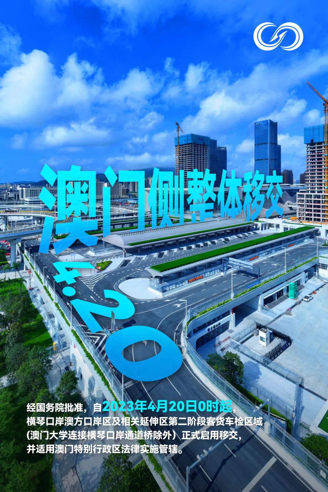 经国务院批准,自2023年4月20日0时起,横琴口岸澳方口岸区及相关延伸区第二阶段客货车检区域(澳门大学连接横琴口岸通道桥除外)正式启用移交,并适用澳门特别行政区法律实施管辖。