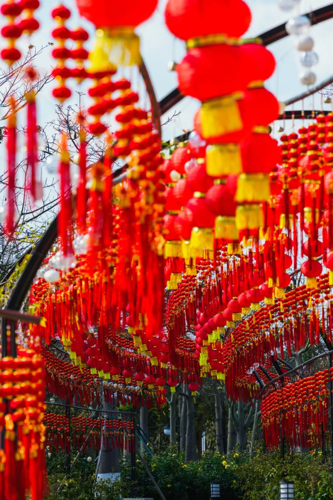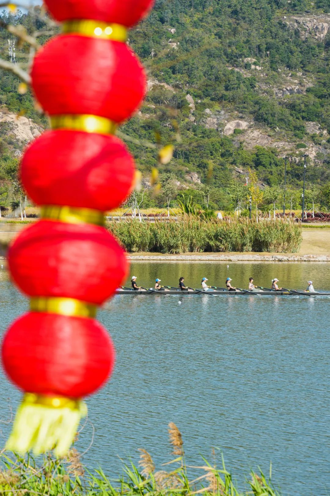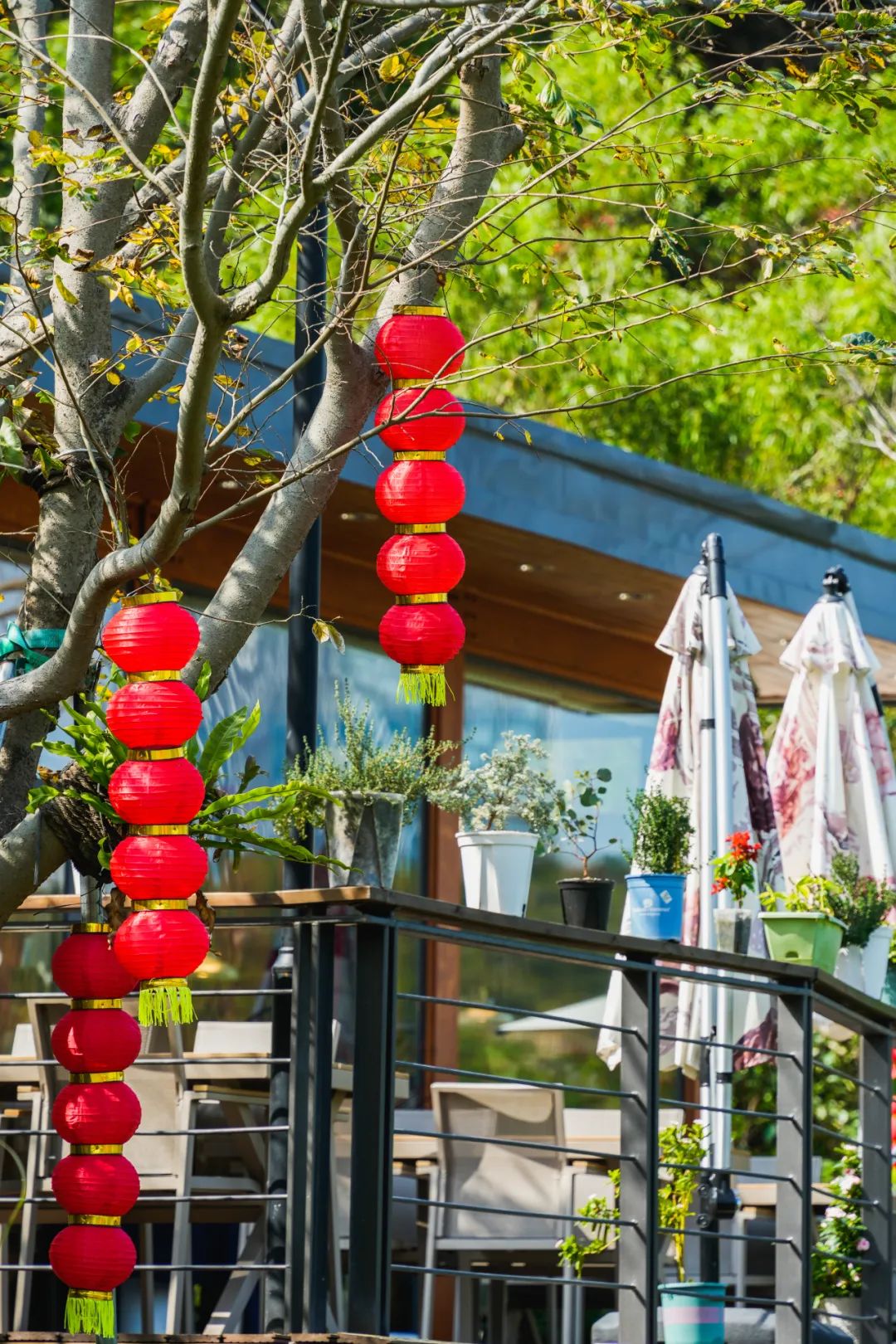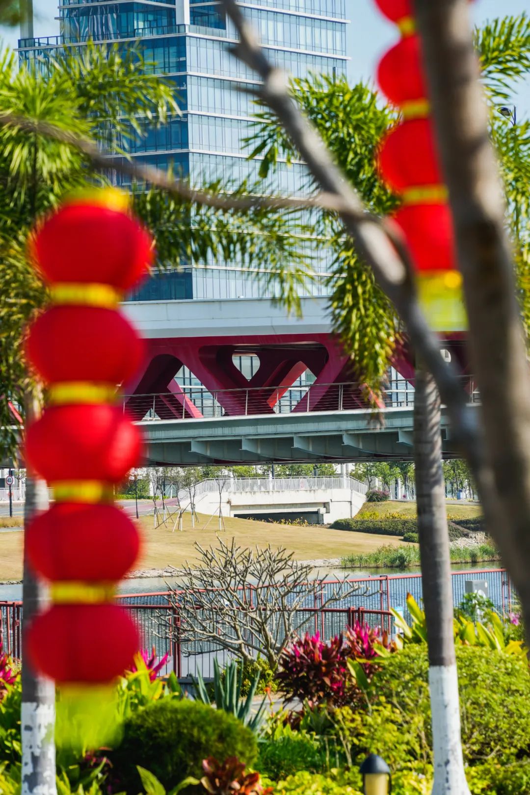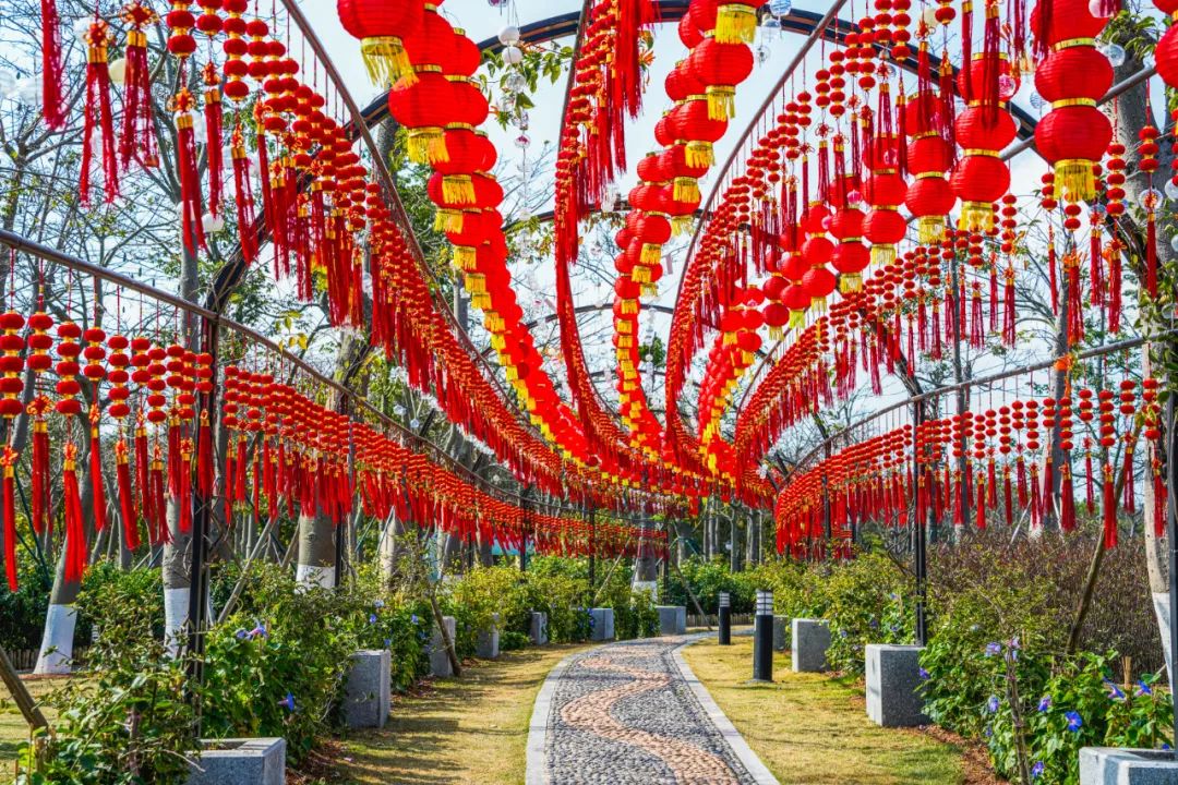 天沐河赛艇公园已悄悄“喜上树梢”,火红的灯笼串儿相继攀上枝头;天沐河两岸的绿水青山,在阳光与微风中岁月静好;通往小横琴山的山体步道也披上崭新的“红袍”,静候登山游人们的到来;花海长廊的风铃长廊趁此新春良辰,焕然一新,喜庆的灯笼与悦耳的风铃在风中共同起舞……