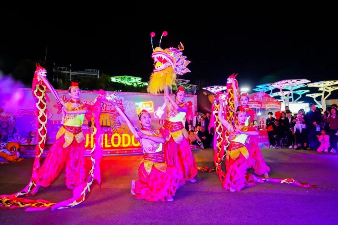 欢庆甲辰龙年元宵佳节的横琴星乐度·露营小镇,绚丽灯光流光溢彩,以传统文化和沉浸式光影场景打造一个“不夜城”。