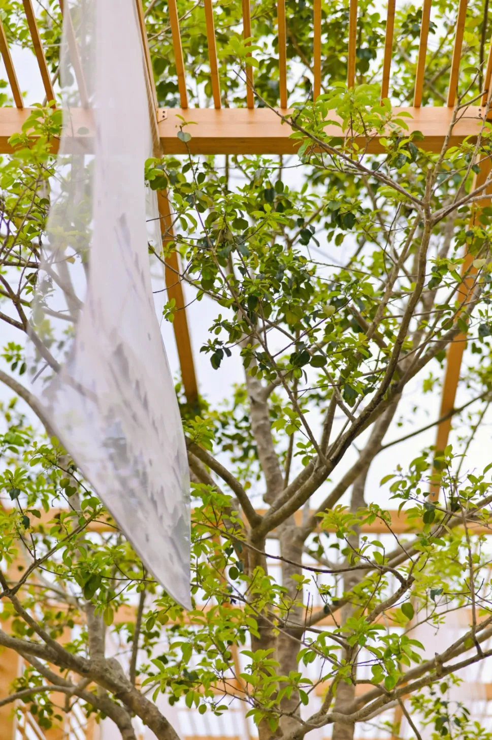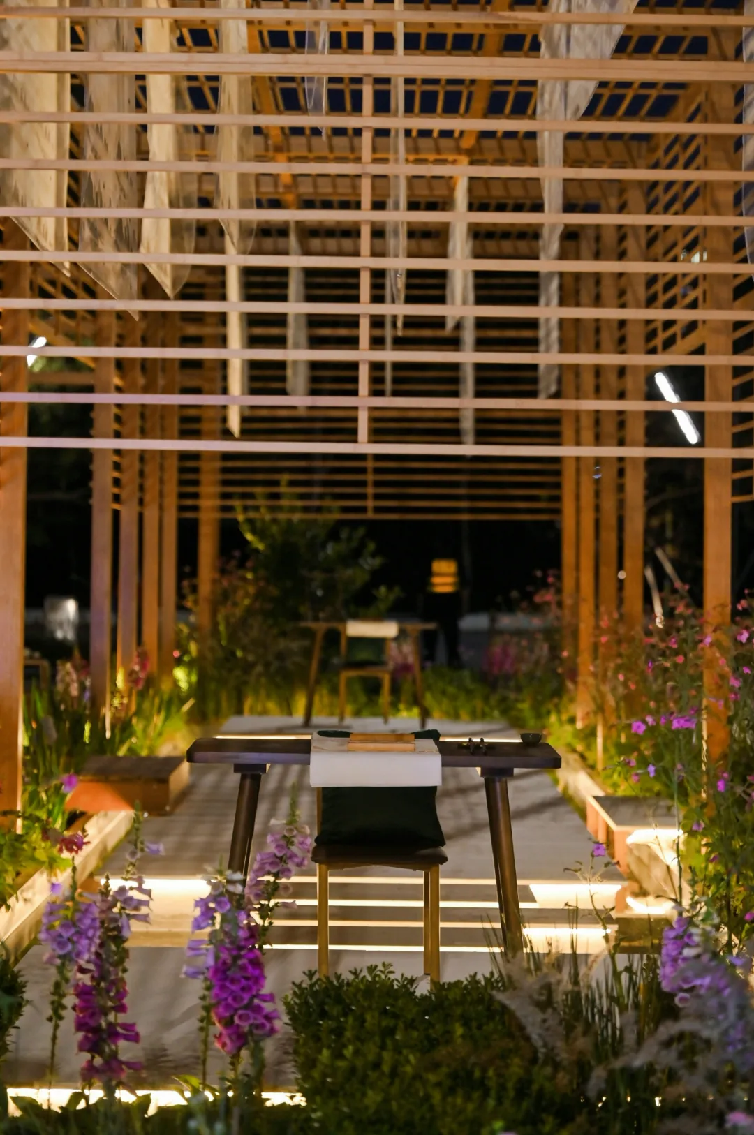 树影婆娑,花香四溢,柠檬草、龙井茶、毛尖、柑橘、迷迭香等香草类植物,洋溢着沁人的花草清香,与茶文化主题交织呼应。