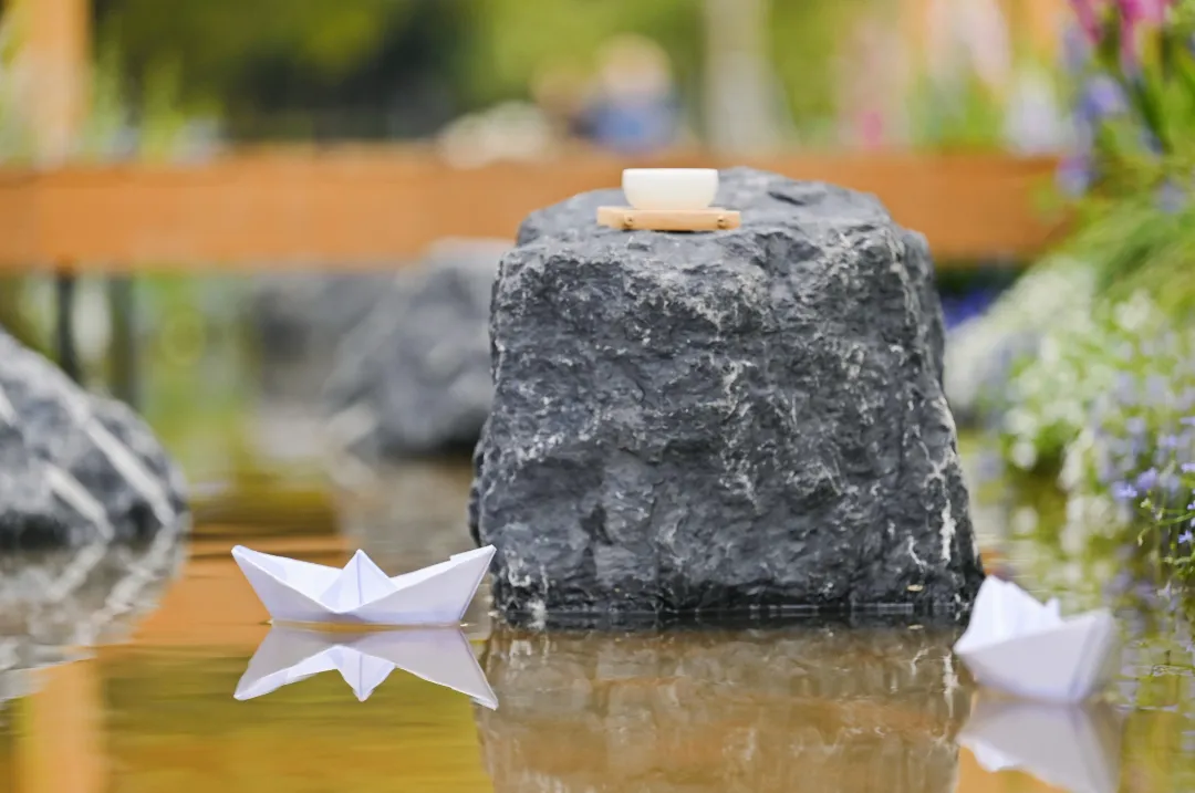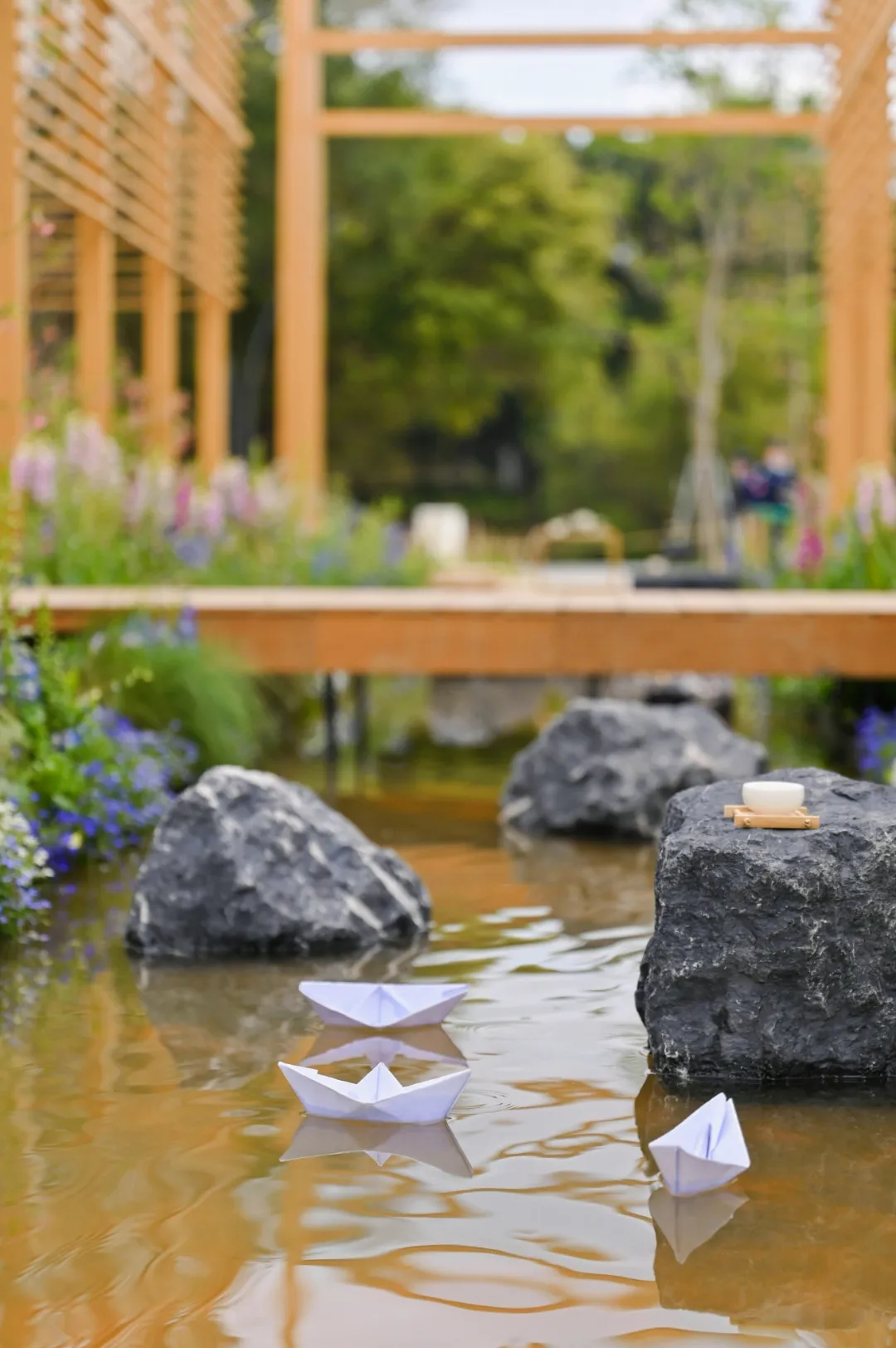 横琴是一座生态岛屿,水元素代表了横琴的历史文化背景,循环互动装置中的纸船象征着曾经的小渔船发展成为中国式现代化建设中扬帆起航的大船,在高速发展的同时,追本溯源,不忘初心。