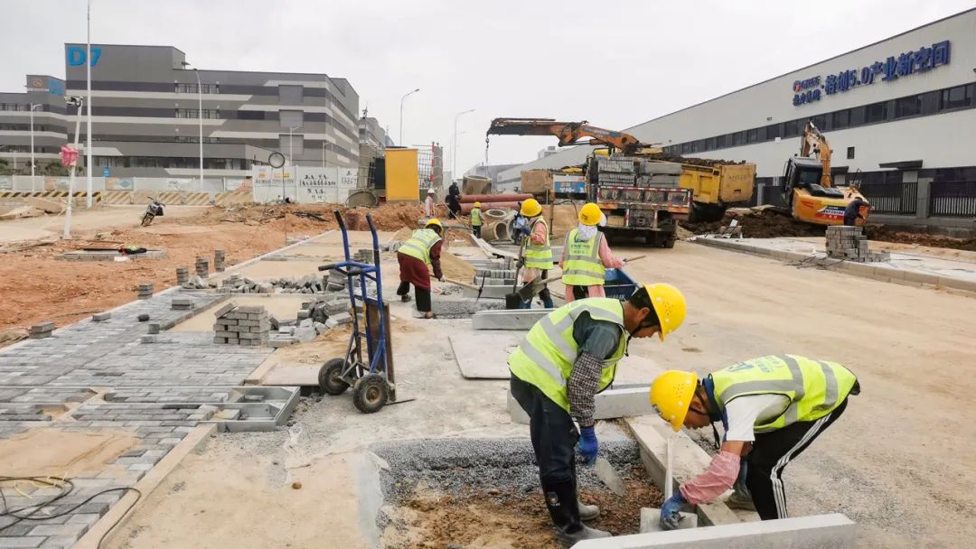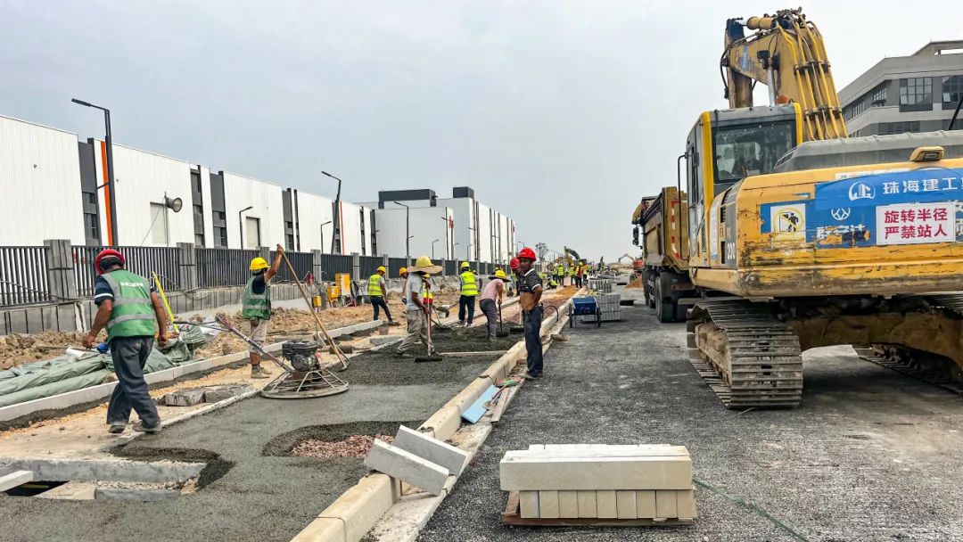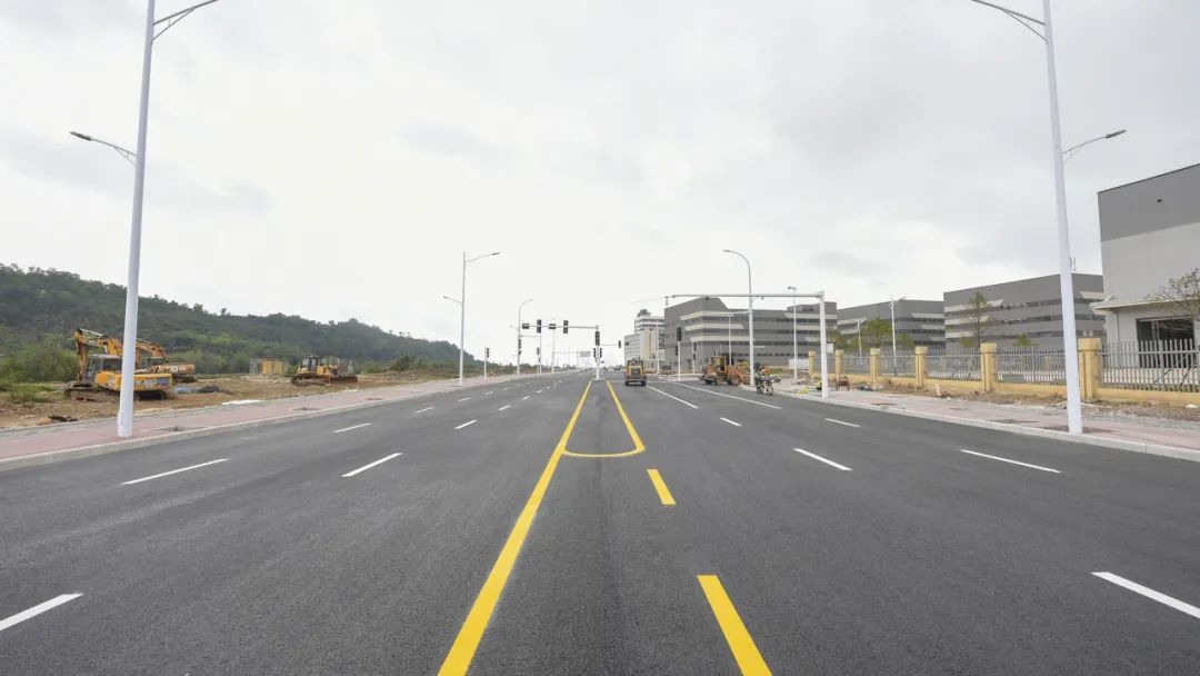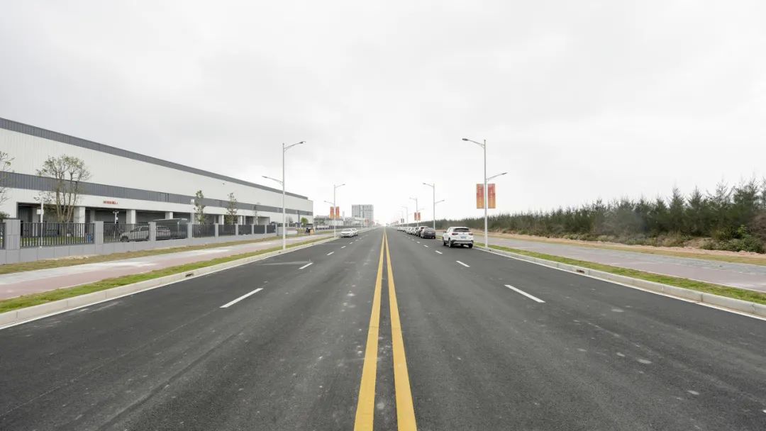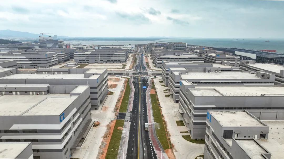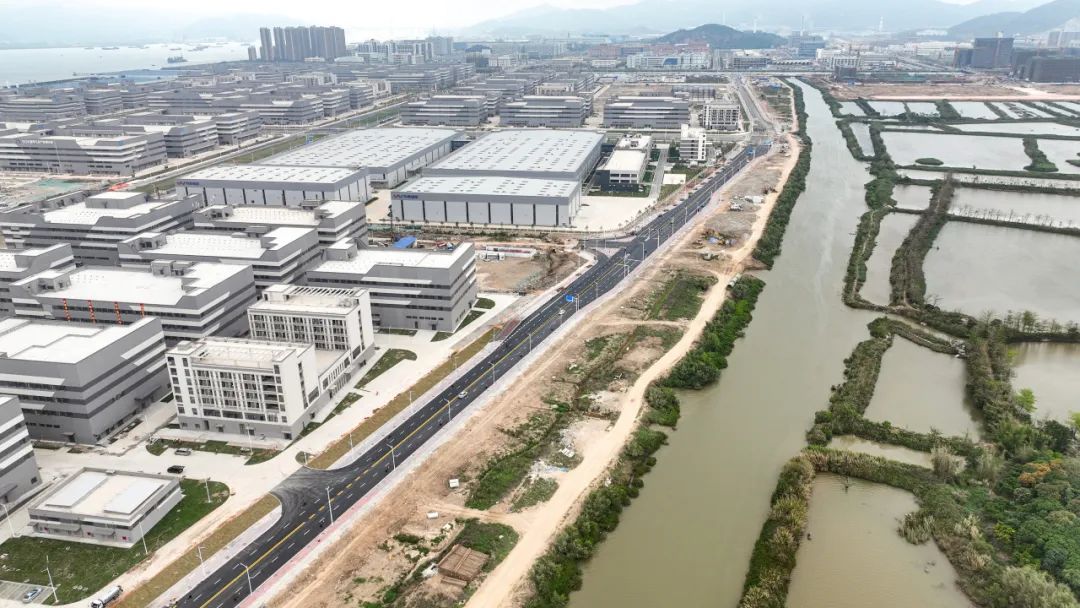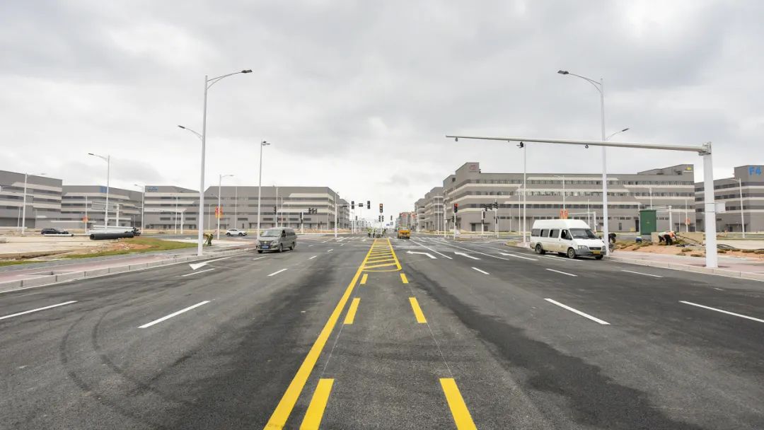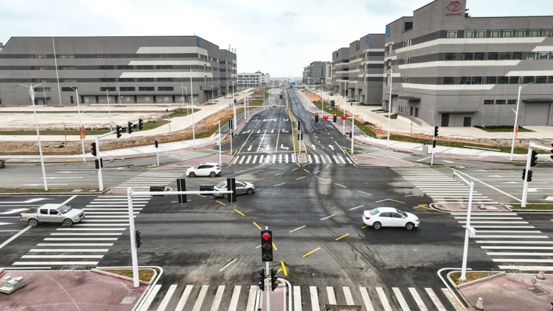 2024年1月30日,雷蛛大道、欣港路、马山北路等4条主路和其他路段约6km的道路已按期完成,二围北片区初步形成“一大环、两小环”交通网络,基本满足各厂区出入需求。