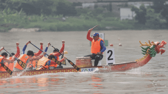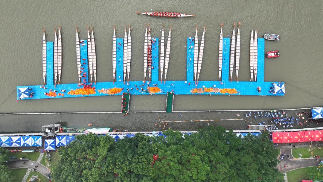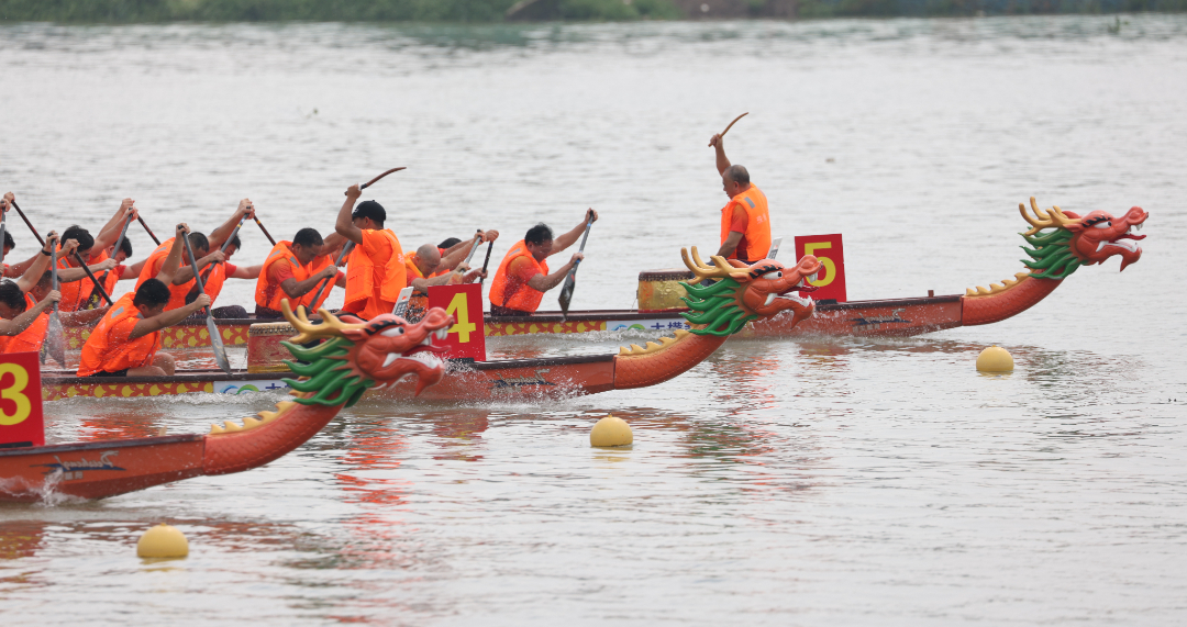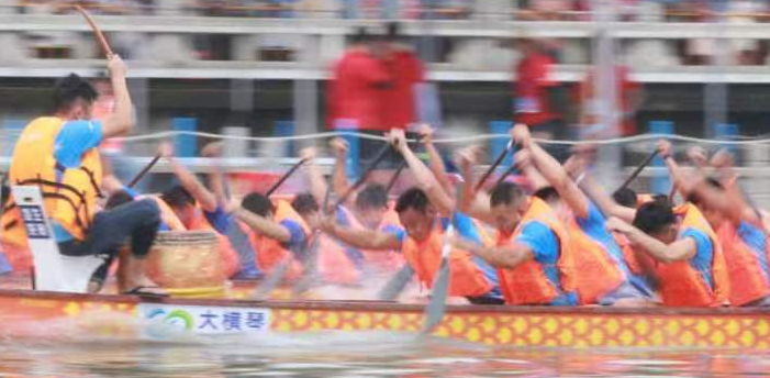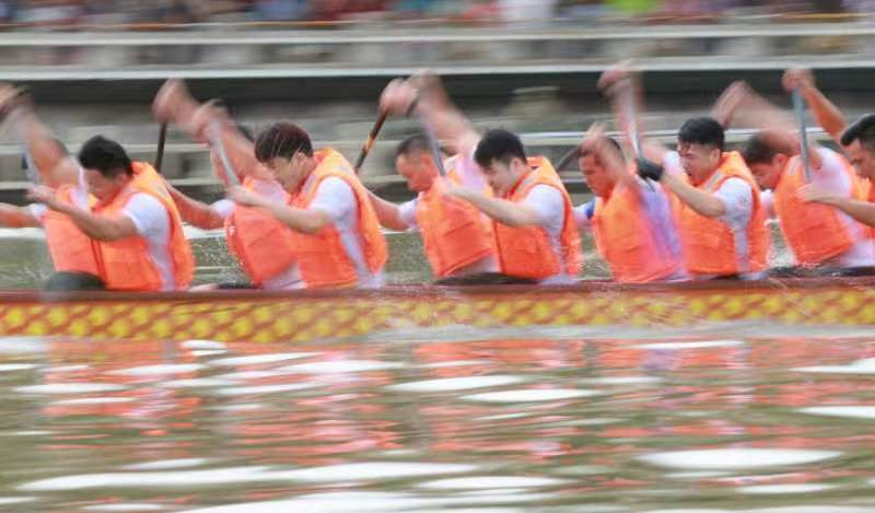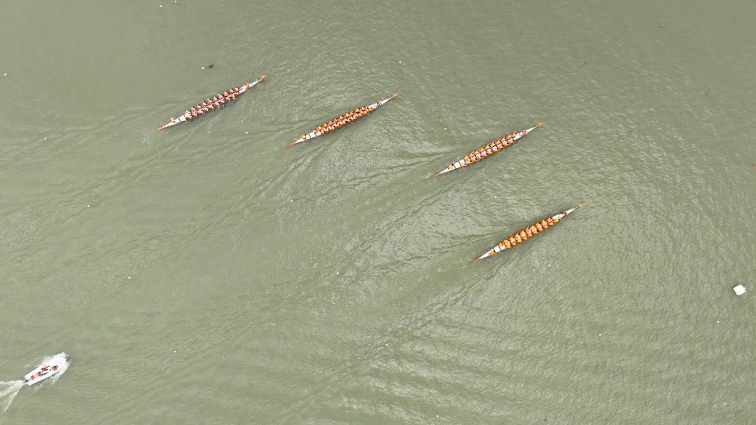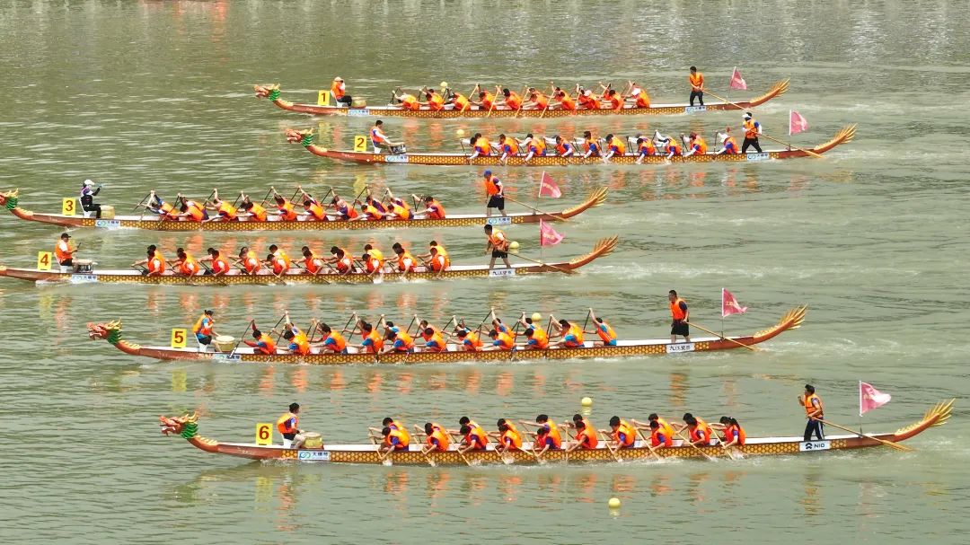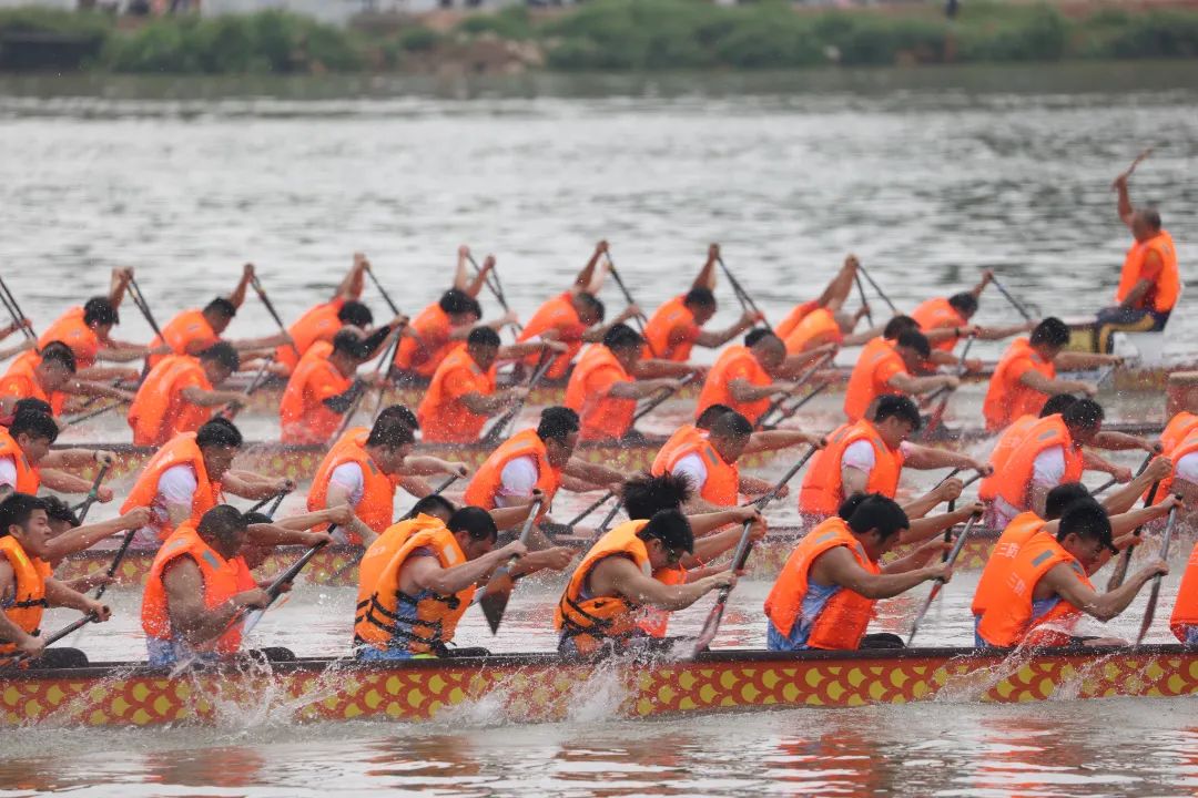 云旗猎猎,锣鼓频催。赛场上,在富有节奏的鼓声下,整齐划一的动作,奋力挥桨、劈波斩浪,河面上演着“速度与激情”。