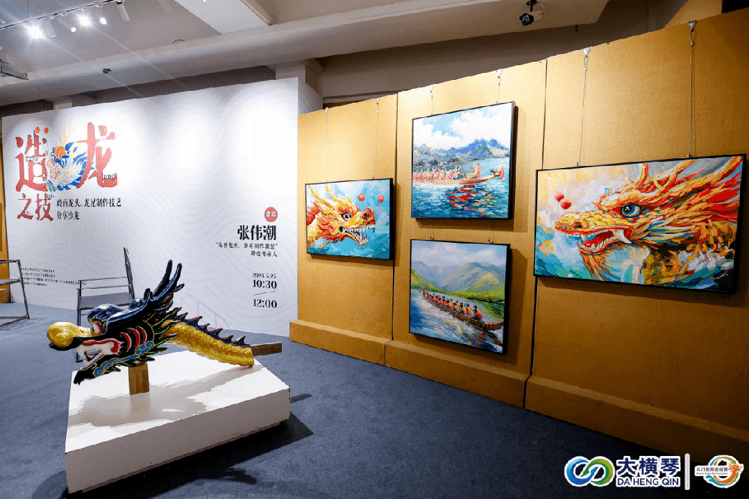 斗门龙舟赛深厚底蕴,不仅仅是一场水上竞渡,更是一系列民俗文化的集大成者。睇龙船、叹非遗,与比赛同步进行的,还有“龙腾黄杨——珠海龙舟民俗文化艺术展”和传承人张伟潮分享的“端午龙舟龙头龙尾制作技艺”沙龙。