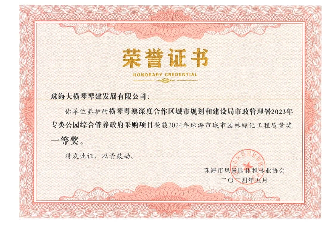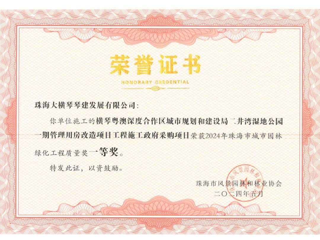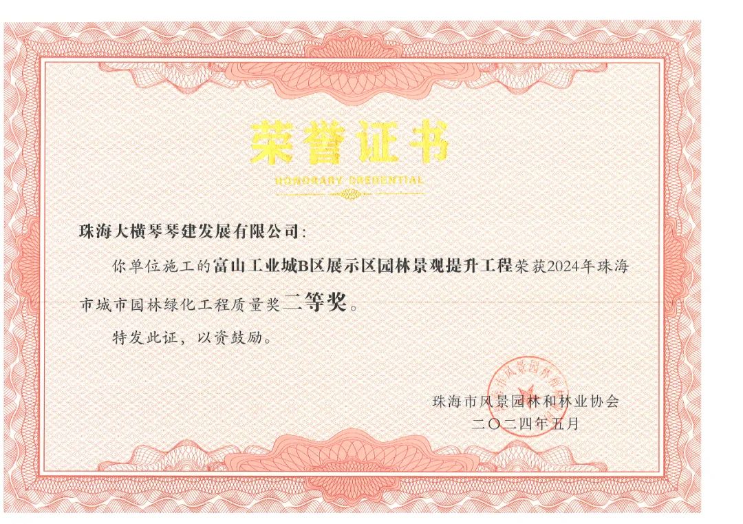 横琴粤澳深度合作区城市规划和建设局市政管理署2023年专类公园综合管养政府采购项目、横琴粤澳深度合作区城市规划和建设局二井湾湿地公园一期管理用房改造项目工程施工政府采购项目,荣获2024年珠海市城市园林绿化工程质量奖一等奖!富山工业城B区展示区园林景观提升工程,荣获2024年珠海市城市园林绿化工程质量奖二等奖!