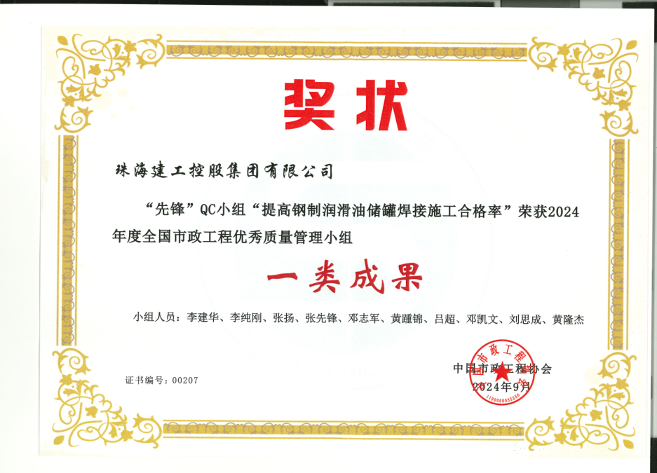 在本次QC小组活动中,珠海建工集团开展了一系列业务培训,组织技术条线输出了QC成果共33个课题,其中《提高钢制润滑油储罐焊接施工合格率》获得国家级一类成果;其余成果中15个课题荣获省级优秀QC成果:2个课题荣获省级一类成果;6个课题荣获省级二类成果;7个课题荣获省级三类成果;技术研发中心临时负责人李建华荣获优秀发布者,本次QC小组活动的优异成绩,实现了公司QC成果奖在国家级奖项、省级奖项方面零的突破,为公司工程项目评优奠定了基础。