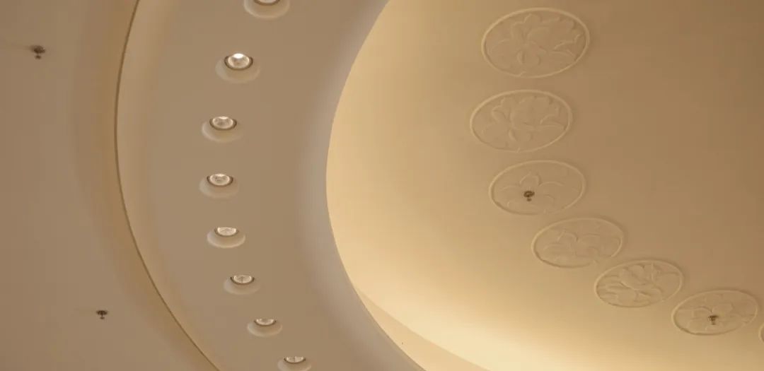 会议中心前厅顶面采用25朵花代表澳门回归祖国25周年,造型中提取木棉花、莲花写意形体作为装饰元素,图案相互交错,寓意“一国两制”方针下粤澳共商、共建、共管、共享的新模式。