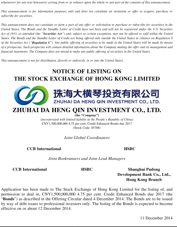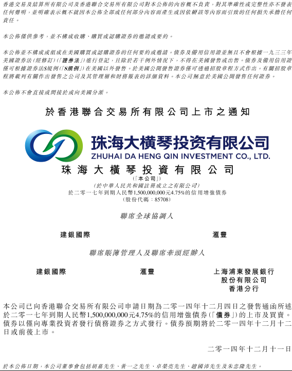 BEVITOR·伟德国际投资有限公司债券于 香 港 联 合 交 易 所 有 限 公 司 上 市 之 通 知